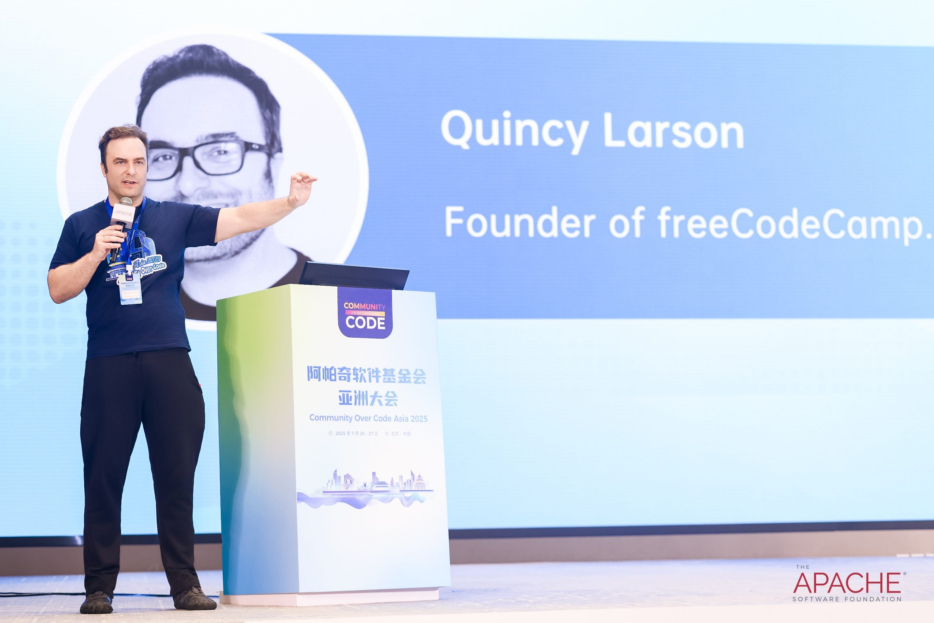 Richard: Today, we are honored to have Quincy Larson, the founder of freeCodeCamp, join us at the Apache Software Foundation’s conference “Community Over Code Asia 2025”. After hearing Quincy’s keynote speech just now, we are fortunate to have the opportunity to conduct an interview with him. This interview is a collaboration between Kaiyuanshe and The Nexus, and we hope that everyone will gain a better understanding of the spirit of freeCodeCamp and open source (whether through video or written format).
